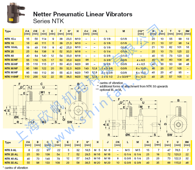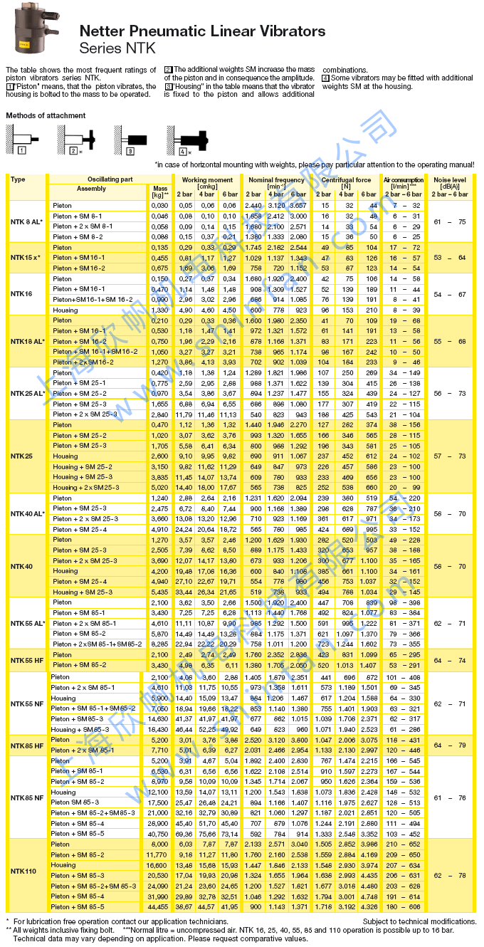 NTK型氣壓振動器可分為硬化樹脂外殼,及鋁合金硬化染黑外殼。本體的中心有一活塞往復(fù)式振動,活塞軸心可加重錘以改變,出力及轉(zhuǎn)速、振輻。氣壓式運轉(zhuǎn),可以增加不同重錘,活塞非常輕巧。本體的運作并不會產(chǎn)生撞擊。非常嚴(yán)謹(jǐn)?shù)纳a(chǎn)制造。 硬化樹脂本體NTK8AL,NTK15X,NTK18AL,NTK25AL 可在免潤滑劑下運轉(zhuǎn)。使用溫度5°C ~ 60°C 使用型號可由非常輕巧的NTK8AL型,一直到NTK110型。